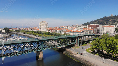 Obraz premium The Gustave Eiffel Bridge over the river Lima in Viana do Castelo. Aerial panoramic cityscape view of Viana and the Marina.