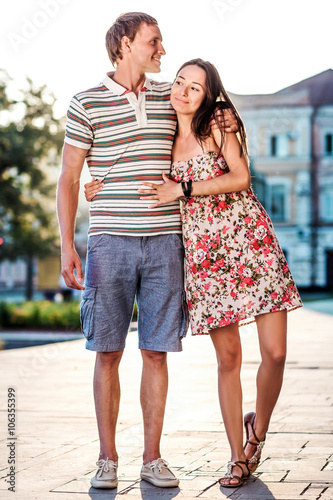 Fototapeta premium The guy embraces his girlfriend during a walk in the fresh air