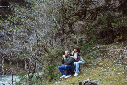 © Denis Vyalov, Fototapeta premium The guy plays the girl on the pipe. In the woods.