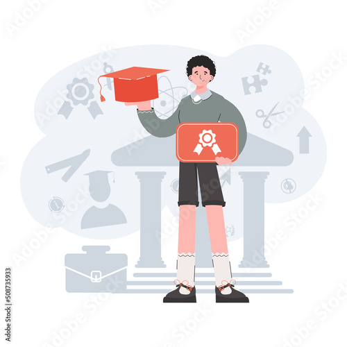 © Javvani, Obraz premium The guy stands in full growth and holds a graduation cap and a diploma. Education. Element for presentations, sites.