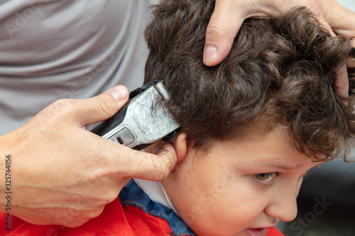 Naklejka premium The hairdresser cuts the hair of a boy with a machine