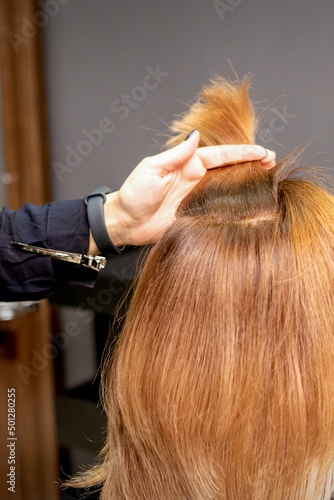 Obraz premium The hairdresser holds a strand in hand between fingers of the female hair....
