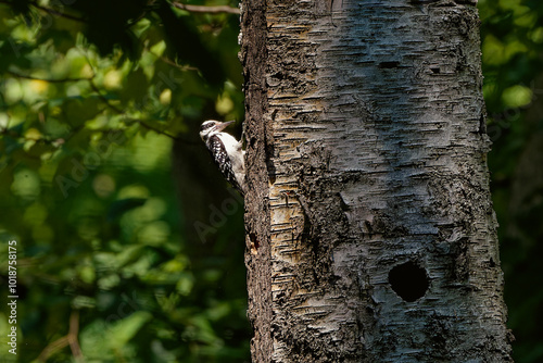 © Denny, Obraz premium The hairy woodpecker (Leuconotopicus villosus). Natural scene from Wisconsin state park