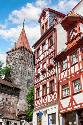 © Sergey, Obraz premium The half-timbered building and the white stone tower. Nuremberg, Bavaria,Germany.