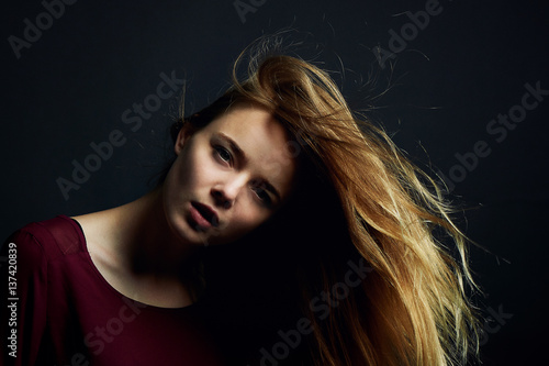 © gal2007, Fototapeta premium The hand in her hair. Beautiful young girl dancing. Hair flying. Shooting in Studio