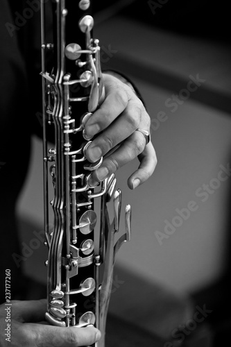 Fototapeta premium The hand of a musician playing the bass clarinet closeup in black and white