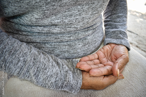 © aekkawin, Fototapeta premium The hand of the sick old woman rests on the lap. Mental health care at home.