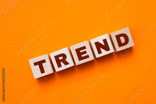 © Uuganbayar, Obraz premium The hand puts a wooden cube with the letter T from the word TREND. The word is written on wooden cubes standing on the yellow surface of the table. Concept.