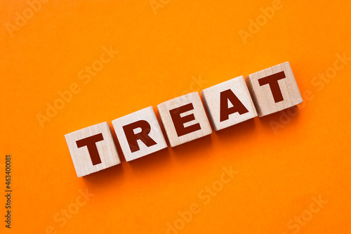 © Uuganbayar, Obraz premium The hand puts a wooden cube with the letter T from the word TREND. The word is written on wooden cubes standing on the yellow surface of the table. Concept.
