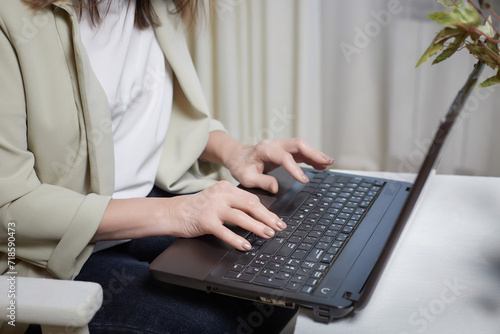 Fototapeta premium The hands of an elderly woman on a laptop keyboard. The lady communicates,...
