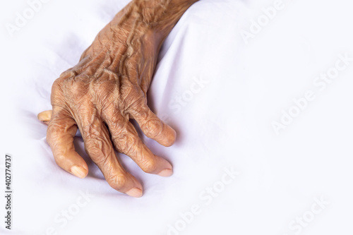 © witsawat, Fototapeta premium The hands of an old woman with rheumatoid arthritis. Diseases caused by degeneration of the joints of the fingers.