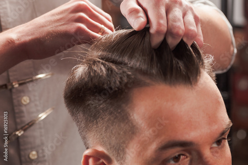 Naklejka premium The hands of barber making haircut to young man in barbershop