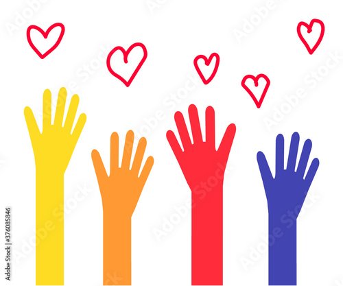 Obraz premium The hands of various people are raised up. Symbol. Vector illustration.