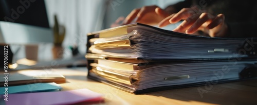 © Miro, Obraz premium The hands working on organized files in a cozy office setting.