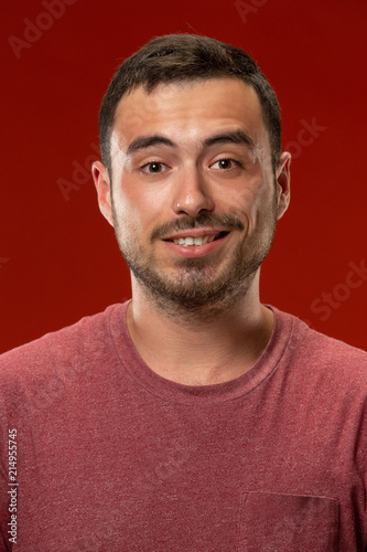 © master1305, Fototapeta premium The happy business man standing and smiling against red background.