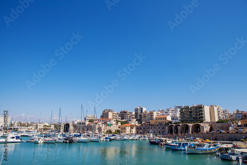© Pitcher, Obraz premium The harbor of Heraklion with ruins of Venetian era buildings and numerous yachts and boats in port, Crete, Greece.