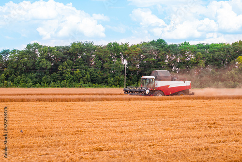 Fototapeta premium The harvester works on an agricultural field harvests wheat on a sunny day