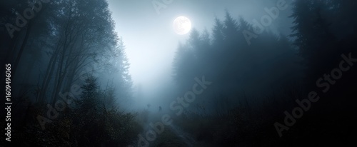© Studio Nova, Fototapeta premium The haunting beauty of a foggy forest under a bright moon.