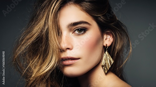 © tao, Fototapeta premium The head of a charming young woman with light brown hair, dark roots, and a gradient effect, looking directly at the camera against a simple gray background.
