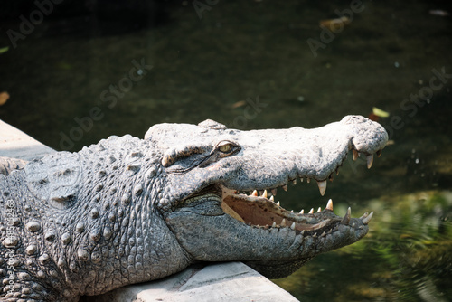 © Huy, Obraz premium The head of a crocodile with dried mud when basking in a zoo