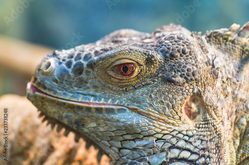 Fototapeta premium The head of a large green ordinary iguana, the eye looks into the camera....