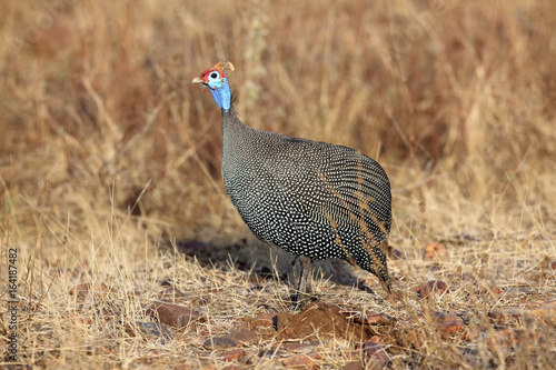 © Karlos Lomsky, Fototapeta premium The helmeted guineafowl (Numida meleagris) in yellow grass in the savanna