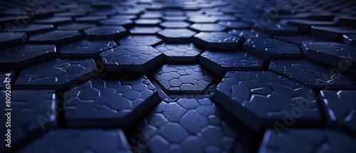 Obraz premium The hexagonal dark blue navy texture, featuring a radial center space, creates a visually appealing 3D rendering backdrop.