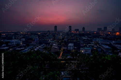Obraz premium The high angle background of the city view with the secret light of the evening, blurring of night lights, showing the distribution of condominiums, dense homes in the capital community