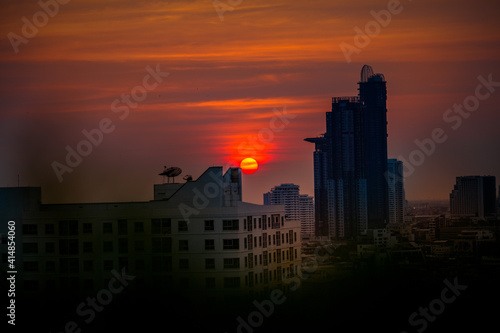 Naklejka premium The high angle background of the city view with the secret light of the evening, blurring of night lights, showing the distribution of condominiums, dense homes in the capital community