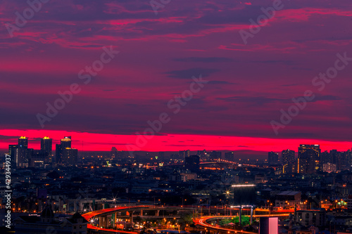 Obraz premium The high angle background of the city view with the secret light of the evening, blurring of night lights, showing the distribution of condominiums, dense homes in the capital community