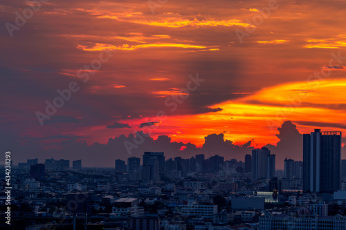 Obraz premium The high angle background of the city view with the secret light of the evening, blurring of night lights, showing the distribution of condominiums, dense homes in the capital community