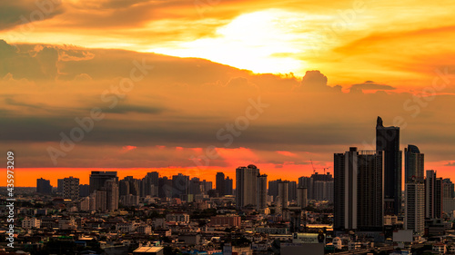 Obraz premium The high angle background of the city view with the secret light of the evening, blurring of night lights, showing the distribution of condominiums, dense homes in the capital community