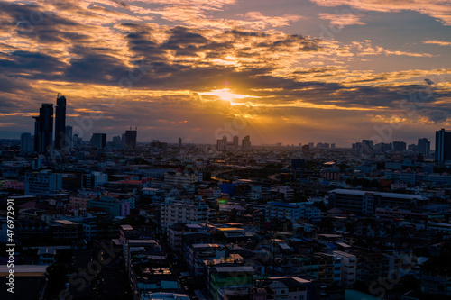 Obraz premium The high angle background of the city view with the secret light of the evening, blurring of night lights, showing the distribution of condominiums, dense homes in the capital community