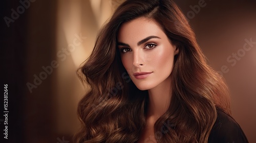 Fototapeta premium The high-resolution advertising image shows a beautiful woman with long, wavy dark brown hair. Creating a sense of luxury and style, it is suitable for showcasing professional beauty studio services.