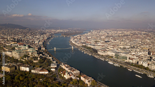 © 072Y, Obraz premium The highest point of Budapest with a view of the city panorama. A river with bridges and ships. Sunset sun. Chain bridge, palace and parliament. Top view.