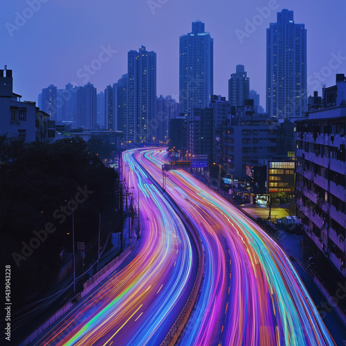 © Nain, Fototapeta premium The highway car rainbow light trails of modern city buildings