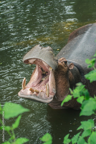 Fototapeta premium The hippo is opening his mouth to see the teeth