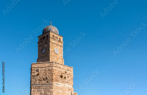 © yalcinsonat, Fototapeta premium The historic clock tower in front of the deep blue sky in Antalya