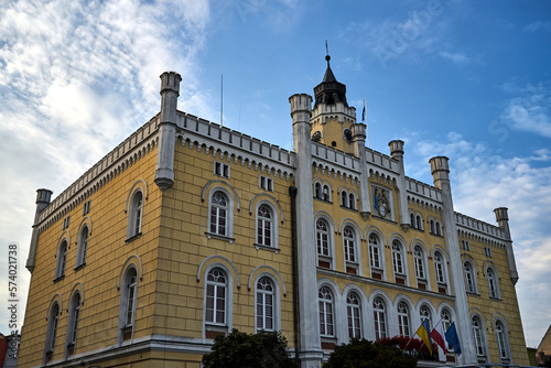 Naklejka premium The historic neo-romanesque building of the town hall with a tower in the city of Wschowa