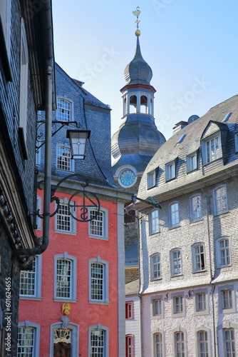 Fototapeta premium The historical center of the medieval town of Monschau, North Rhine Westfalia, Germany, with half timbered houses and the bell tower of the Evangelical City Church