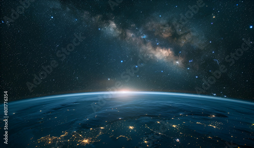 Fototapeta premium The horizon of the Earth floating in space shines in the darkness