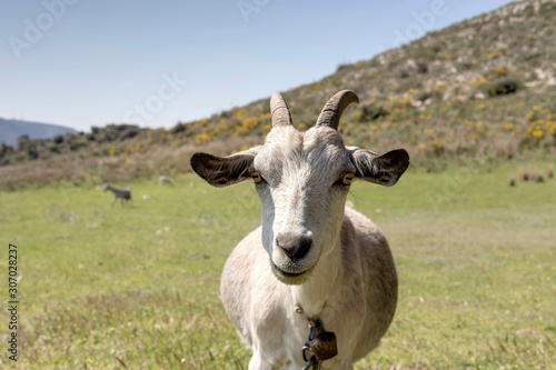 © TETYANA, Fototapeta premium The hornless goat on a mountain pasture