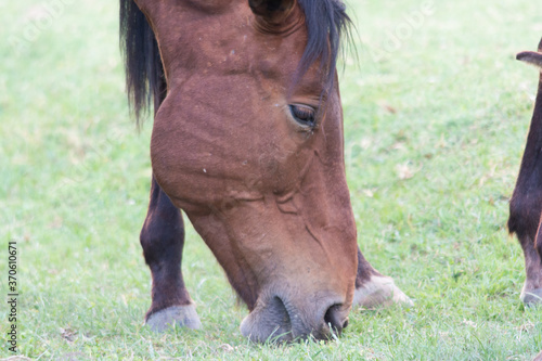 © Arhun, Fototapeta premium The horse is eating grass. Horse breakfast. Grazing.