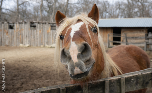Fototapeta premium The horse is smiling, kind, brown. Farming, domestic animals.