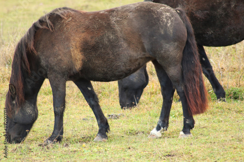 © tolberto, Obraz premium The horse runs and stands in the tall grass. Long mane, a brown horse gallops.