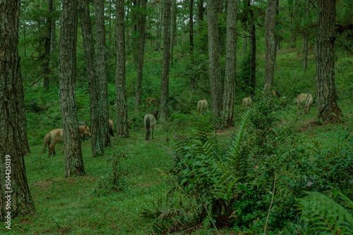 © Min Wan, Obraz premium The horses are leisurely grazing in the pine forest
