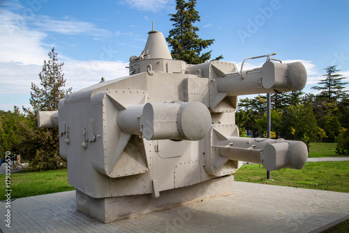 © Victor1153, Naklejka premium The hull of a warship's command and range station on a clear sunny day. Military equipment of the Second World War.