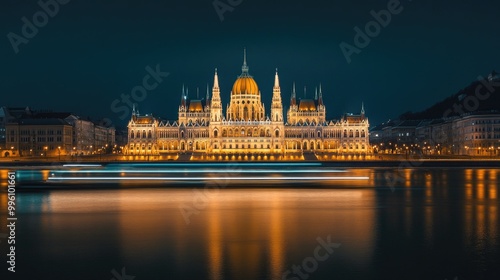 Naklejka premium The Hungarian Parliament building illuminated at night, reflecting beautifully in the Danube River with passing boats in the foreground.