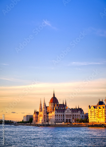 © Jbyard, Obraz premium The Hungarian Parliament Building located on the Danube River in Budapest Hungary at sunset.