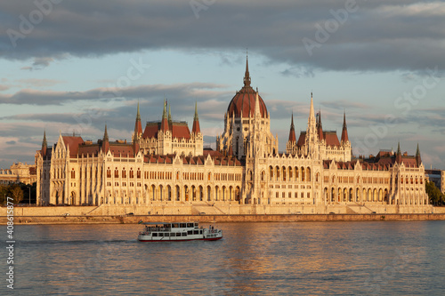 © Alvaro, Fototapeta premium The Hungarian Parliament seen from across the Danube River, on the Buda side, is reflected in the river's waters as the evening lights turn orange, Budapest.